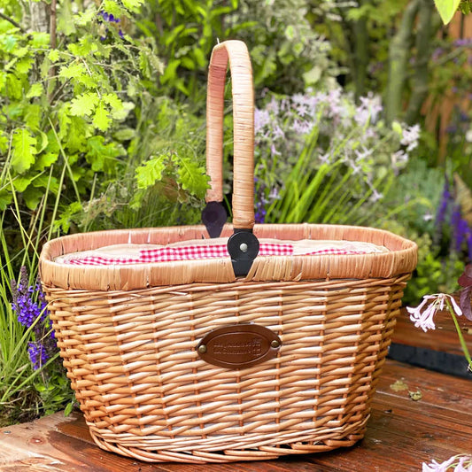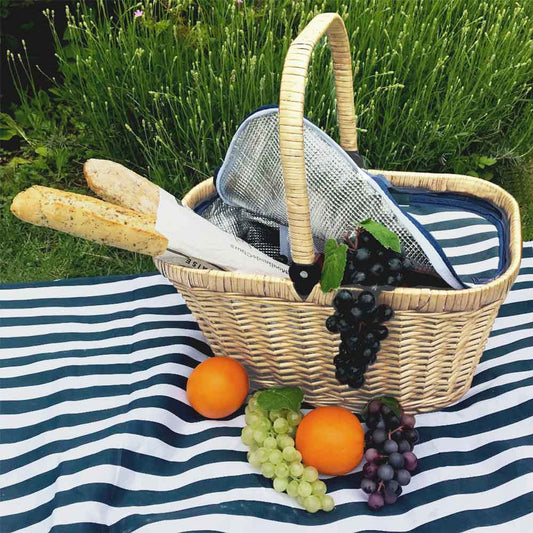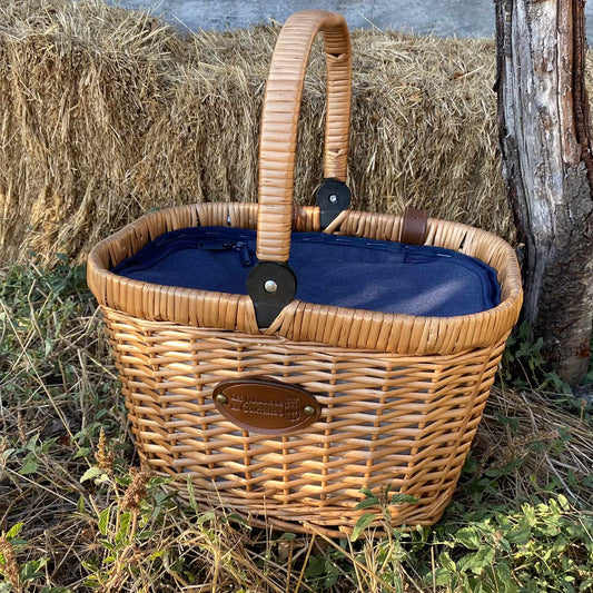 - Rechthoekige rieten mand met handvat: een handgeweven echte rieten mand die kan worden aangevuld met een geïsoleerd compartiment en versierd met een met spons wasbare katoenen stof. Hoewel het het ideale formaat is voor een fietstocht met een picknickstop, kan dit type rieten mand ook worden gebruikt voor een uitstapje naar de markt.
