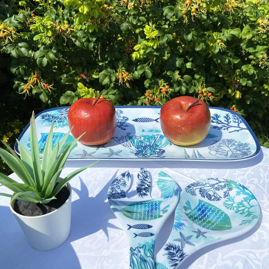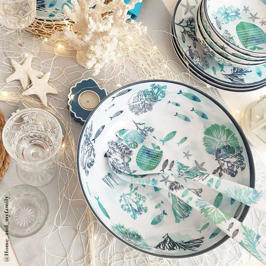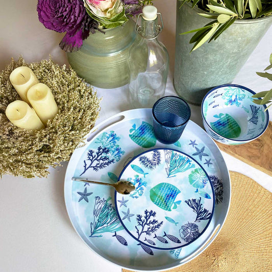 Laat je meevoeren door onze nieuwe collectie melamine servies "Caribbean", onderdeel van de MelARTmine Collectie. Duik in het hart van de Caribische Zee met deze nieuwe collectie melamine servies. De blauwe tinten, de mariene flora en fauna motieven en het moderne, elegante design nemen je mee op ontdekkingsreis.