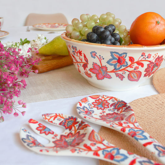 Het combineert de traditionele charme van Jaipur met de moderne handigheid van melamine. Schokbestendig en bijna onbreekbaar, het verenigt elegantie en duurzaamheid. Perfect voor alle gelegenheden, deze collectie melamine servies omvat een breed scala aan stukken: serveerschalen, kommen, slakommen, dienbladen, bestek en placemats. Elk element is versierd met prachtige Indiase bloemen in rood- en blauwtinten, waardoor een exotische en verfijnde sfeer aan je tafel ontstaat. Voeg een vleugje eeuwig India toe aan je maaltijden met de Jaipur collectie.
