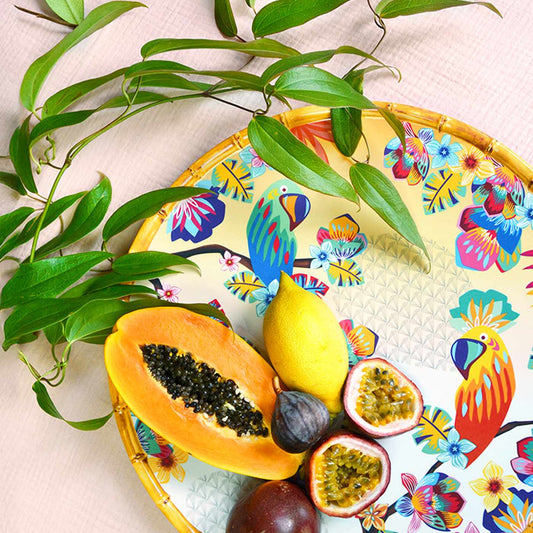 De collectie "Perroquets de Bahia" maakt deel uit van onze melamine serviescollectie: MelARTmine Collection. Met zijn moderne design en kleurrijke motieven zal deze collectie zeker in de smaak vallen! Versierd met veelkleurige papegaaien en exotische bloemen in een oranje gradatie, neemt deze collectie je mee op reis naar het hart van de tropen. Onze Perroquets de Bahia melamine serviescollectie is gemaakt van pure melamine en is daarom gegarandeerd BPA-vrij.