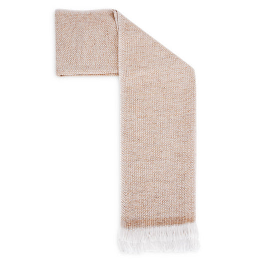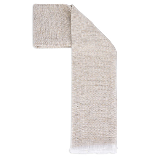 De sjaal van kasjmier en wol met franjes is met speciale zorg voor onze klanten gemaakt en heeft drie soorten patronen (gespikkeld, ruit en kleine chevron).