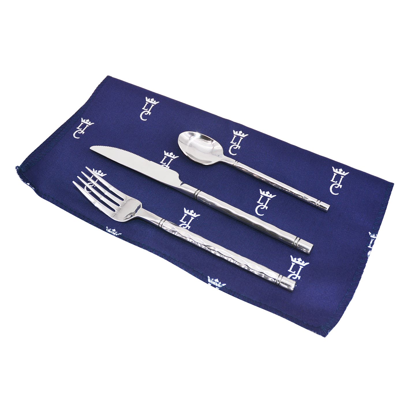 - 2 complete design besteksets in roestvrij staal 18/0, bevatten 2 messen, 2 vorken, 2 koffielepeltjes, op hun plaats gehouden door doorgestikte leren riempjes.