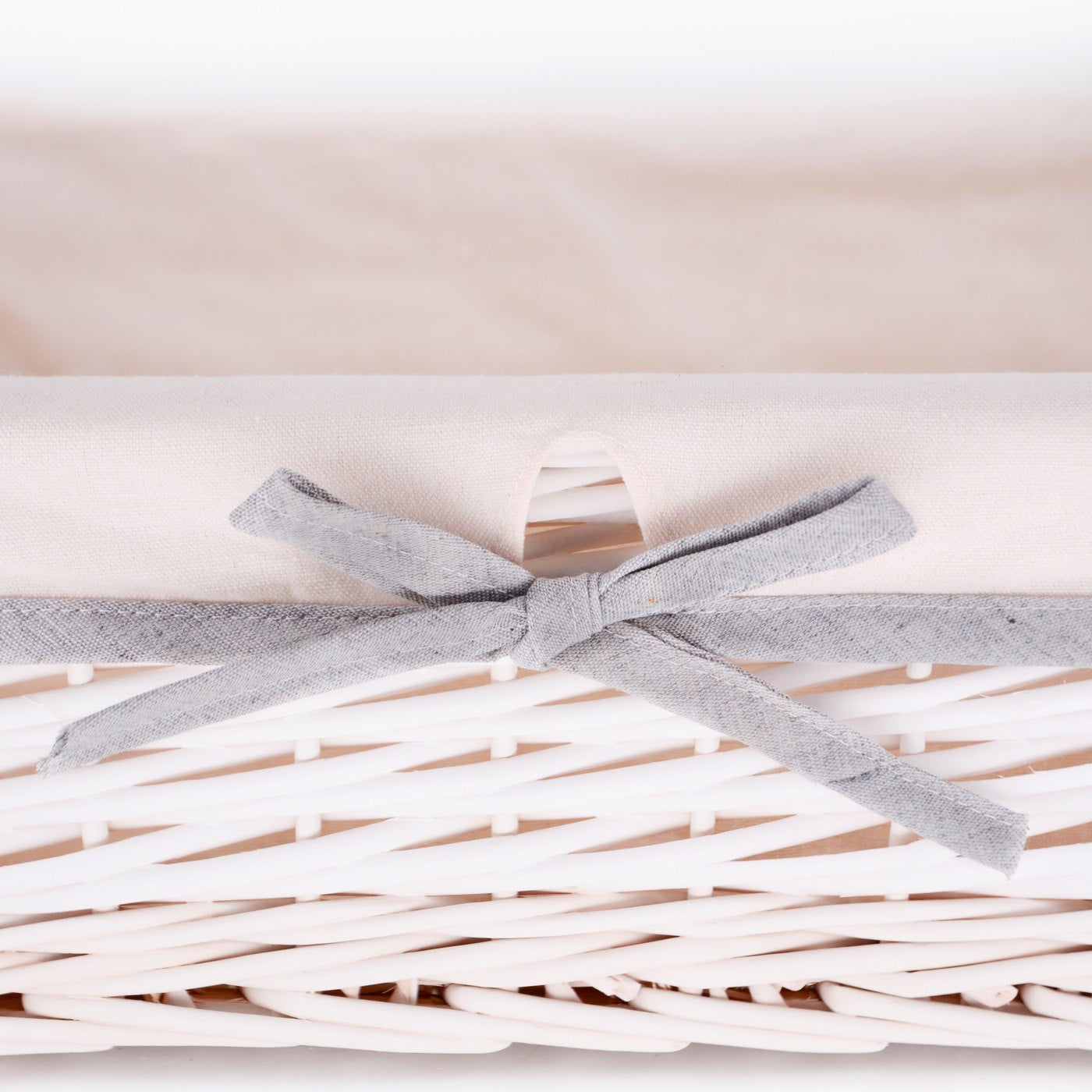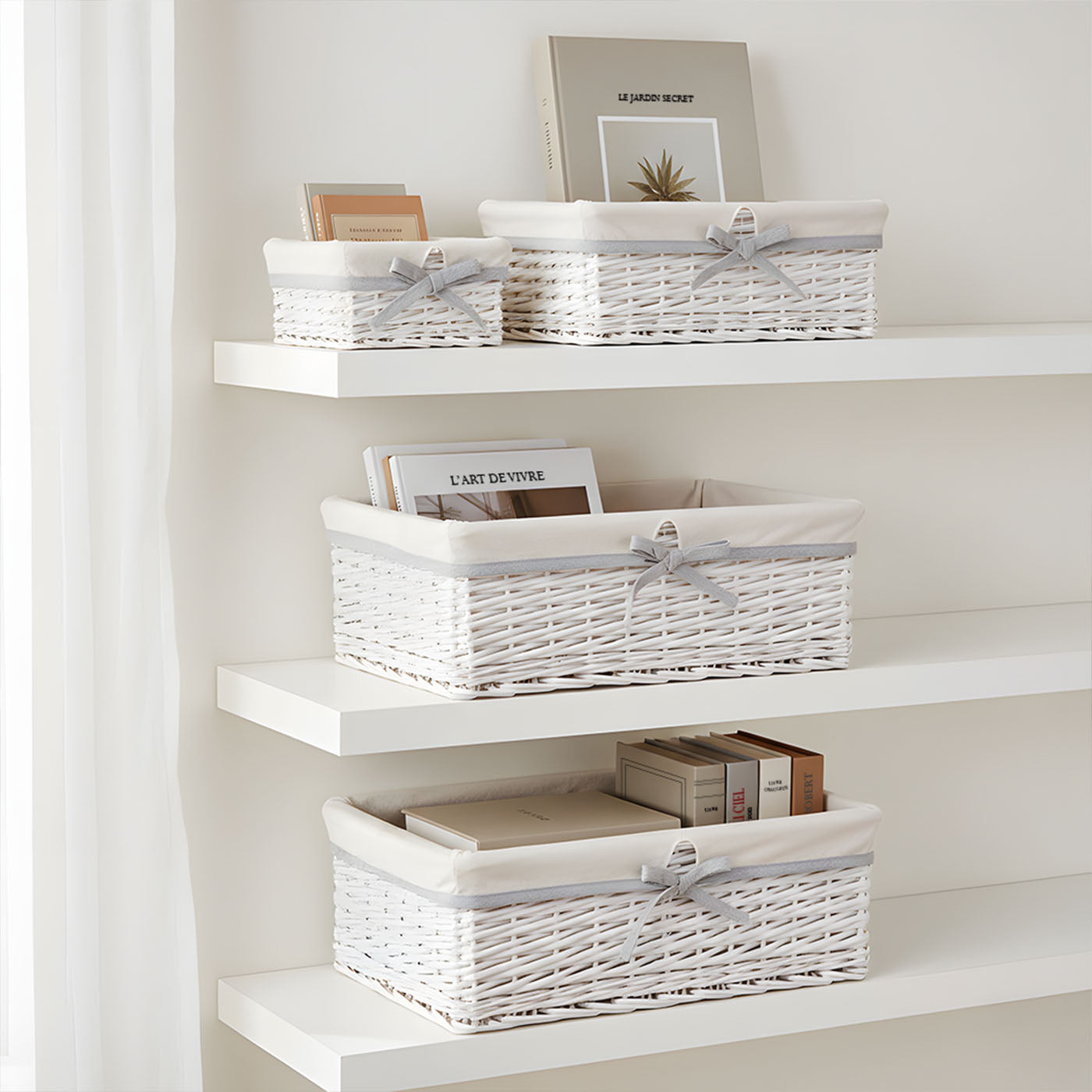 Een set van 4 handgevlochten opbergmanden van witgebeitst riet, voorzien van een witte polykatoenen voering met een subtiele grijze bies. De vier manden zijn nestbaar, zodat ze kunnen worden opgeborgen zonder veel ruimte in beslag te nemen.